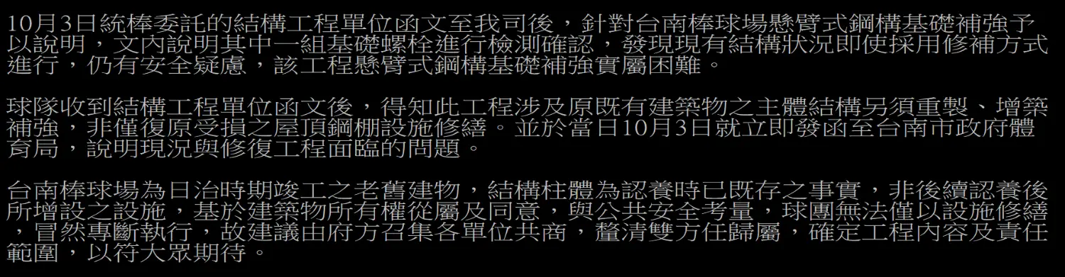 → WongTakashi: 統一希望能打掉重做 但體育局只想趕快修一修趕快重啟 10/18 00:42