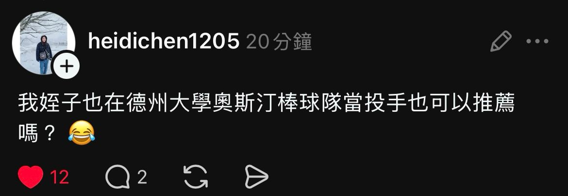 推 CoreySeager: 上面還有一個留言說姪子在德州大學當投手 03/23 19:06