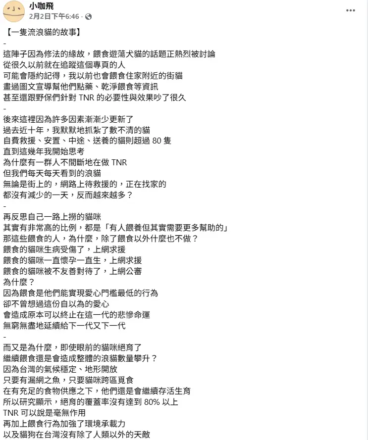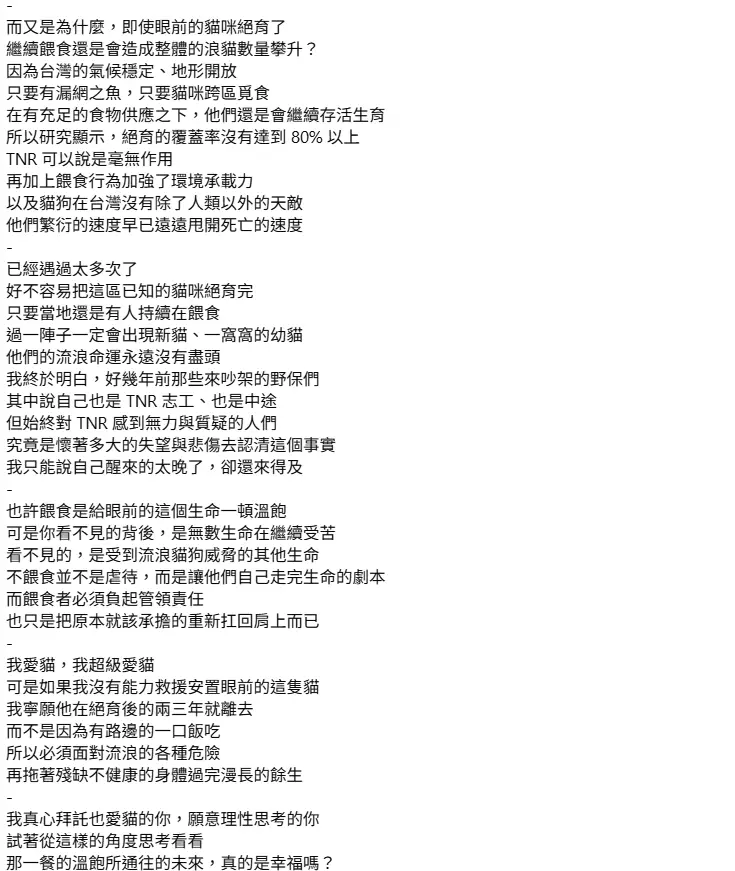 已結紮為目的的餵食我可以接受,但結紮完成就不該再繼續餵了