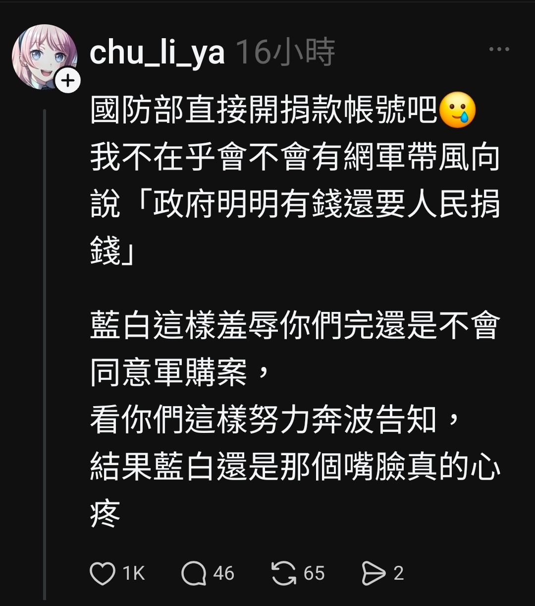→ amare1015: 國防相關需求 我OK 你全捐 哈哈哈哈哈 36.227.104.43 03/27 23:10
