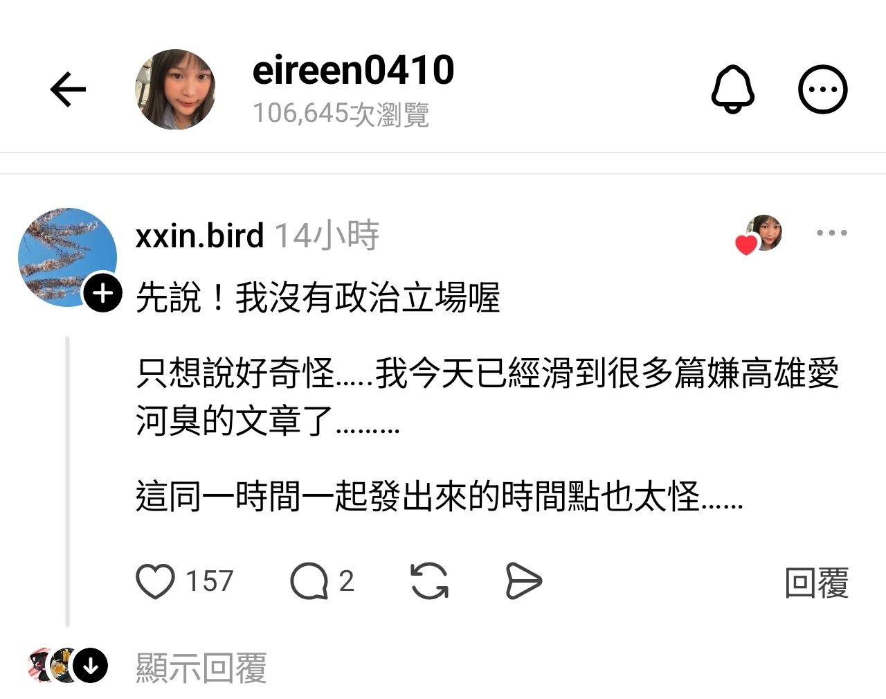 → your0207: 那些人每次講北部才說自己沒政治立場吧223.137.222.111 04/16 01:22