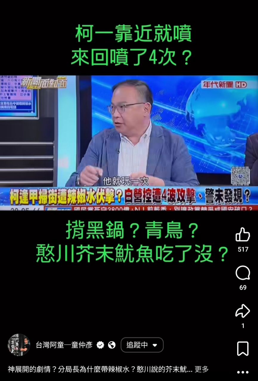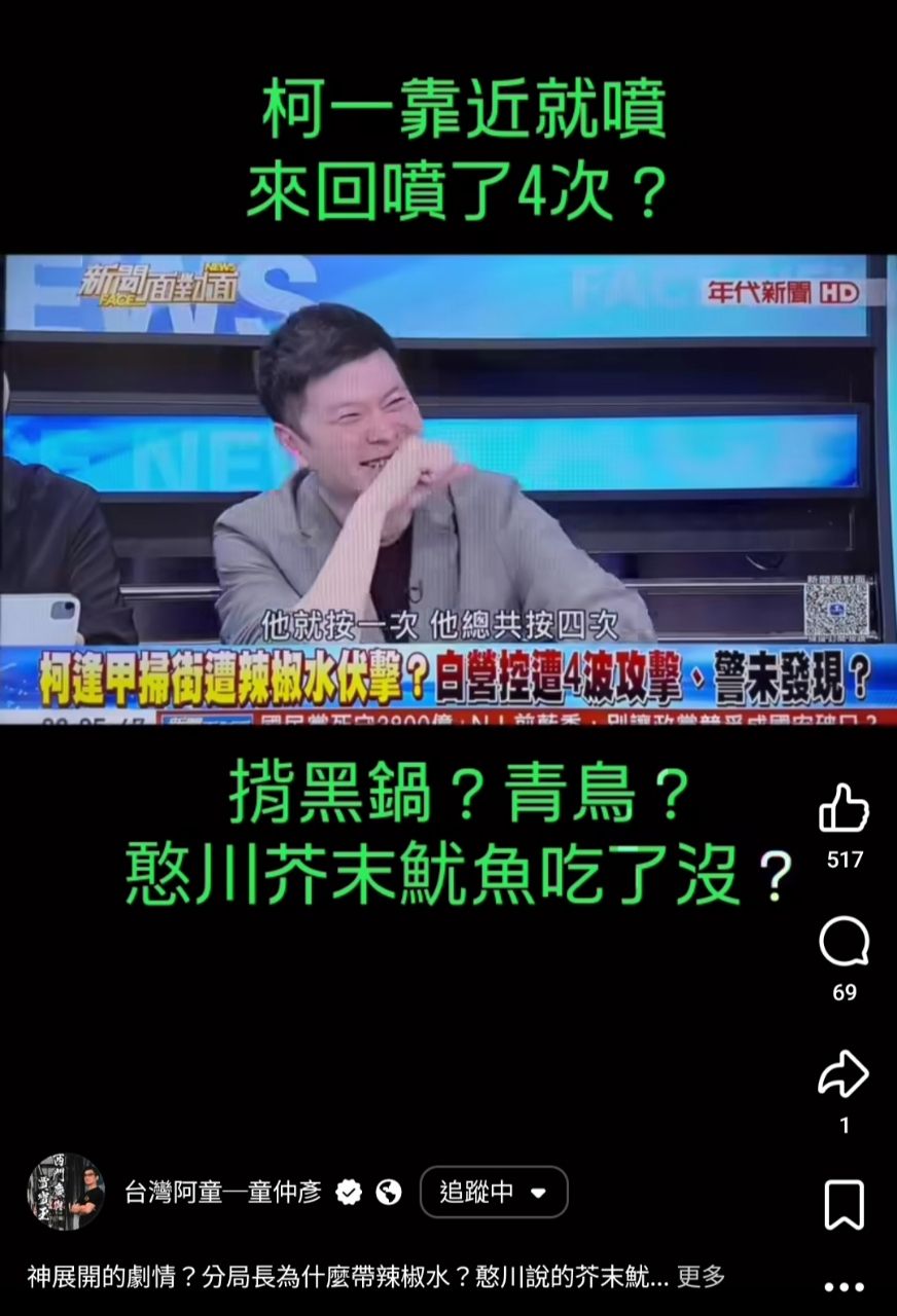 → killme323: 以後是只要藍白去走場就會有辣椒水嗎 125.227.40.229 04/22 11:34