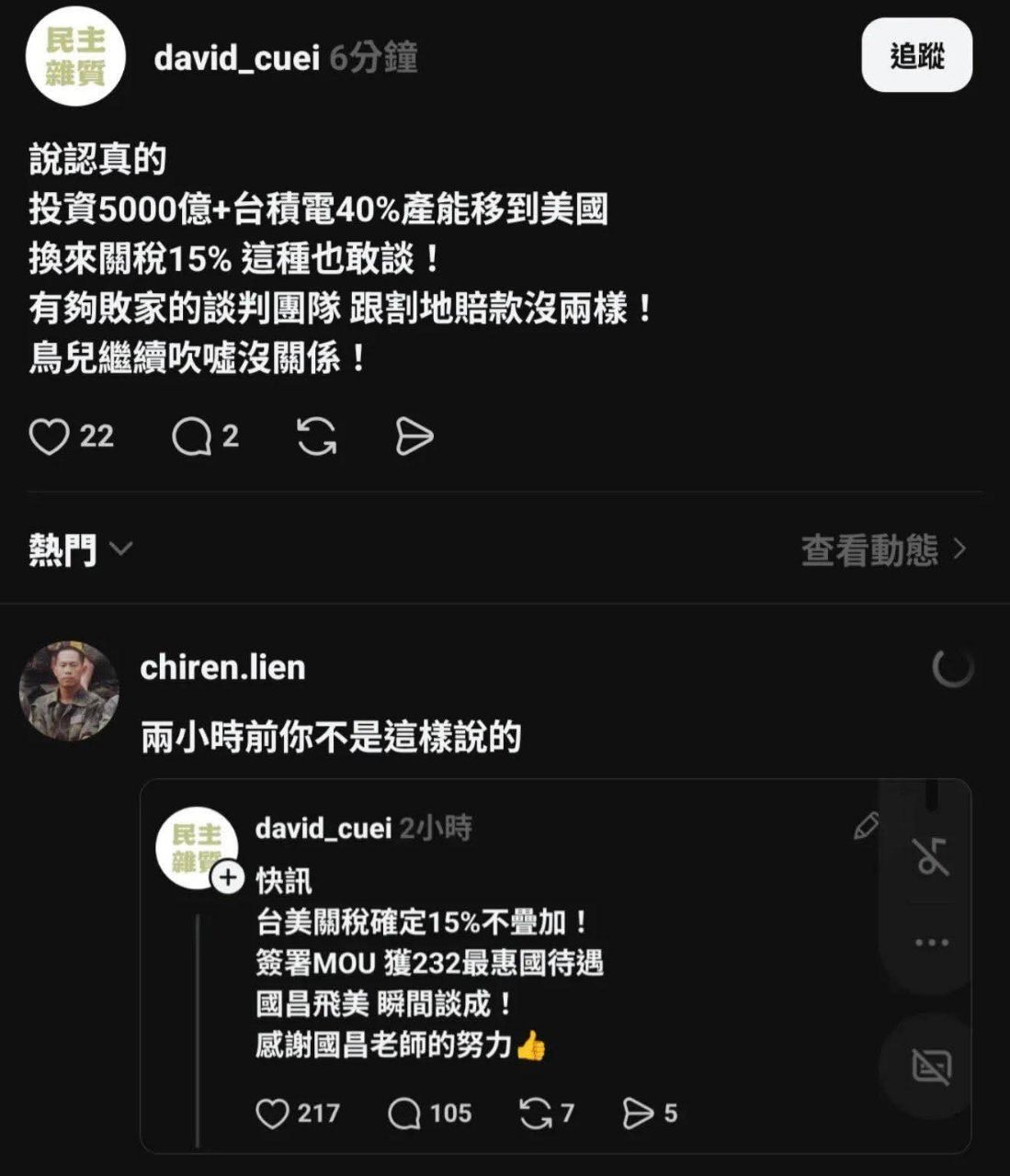 推 bbo9527: 真的 建議綠營綠粉以後用15%關稅 藍白營218.34.113.175 01/16 16:48