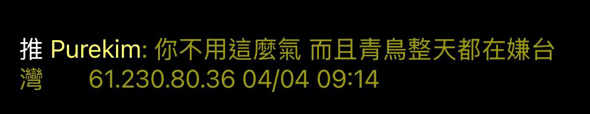 → Purekim: "青鳥整天都在嫌台灣"我又講錯了嗎61.230.80.36 04/04 09:16