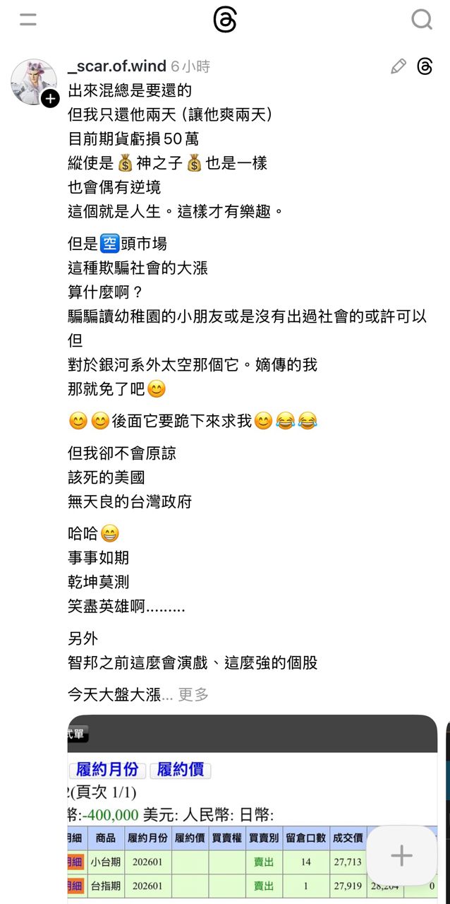推 wolf215 : 老蘇多單套牢也是未實現損益 再嘴老蘇 就要教各位 12/22 15:23
