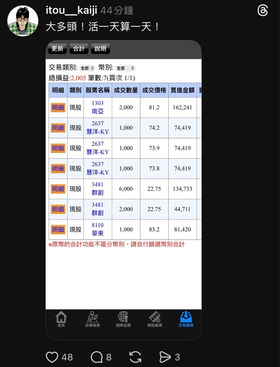 推 tomdavis : 老蘇蘇好帥帥 帶會員錯過大行情 還放空記憶體大賠 01/28 14:03