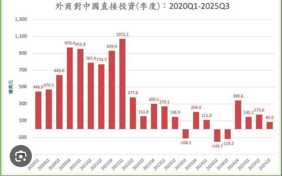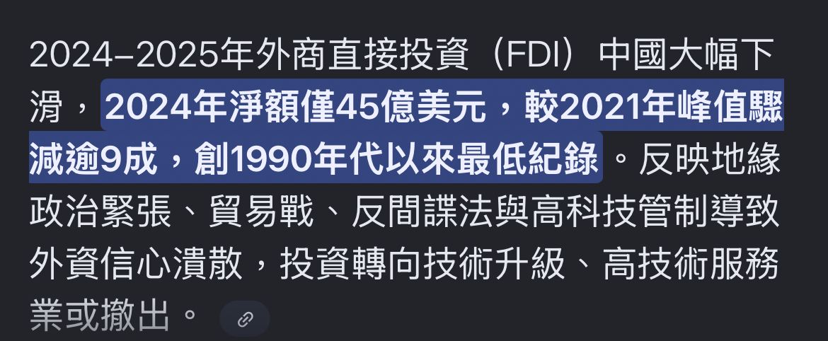 推 rancilio : 2025外國投資中國1000多億美金,台灣100多億美金 02/02 21:35