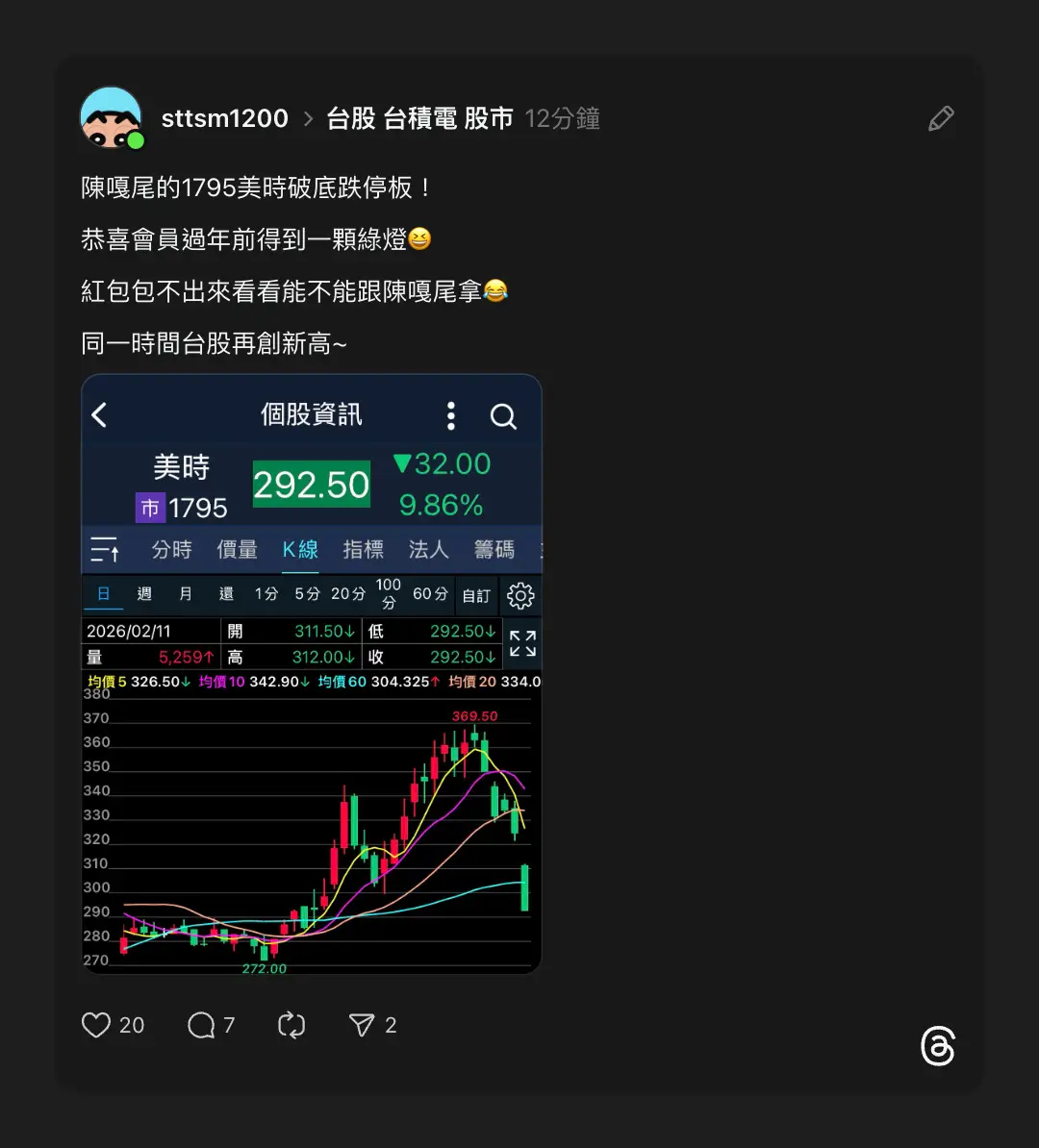 推 kumafez : 請給我一根漲停拜託了 不想抱股過年 02/11 08:36
