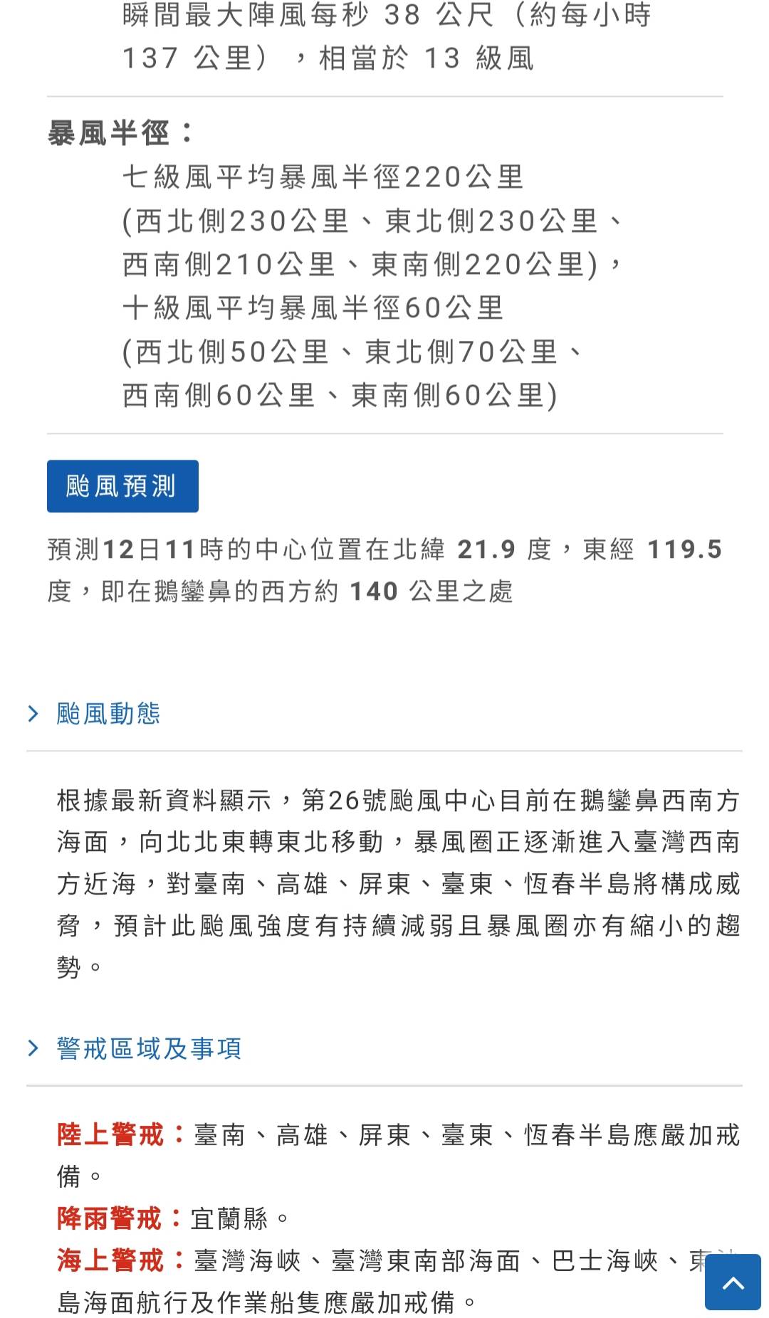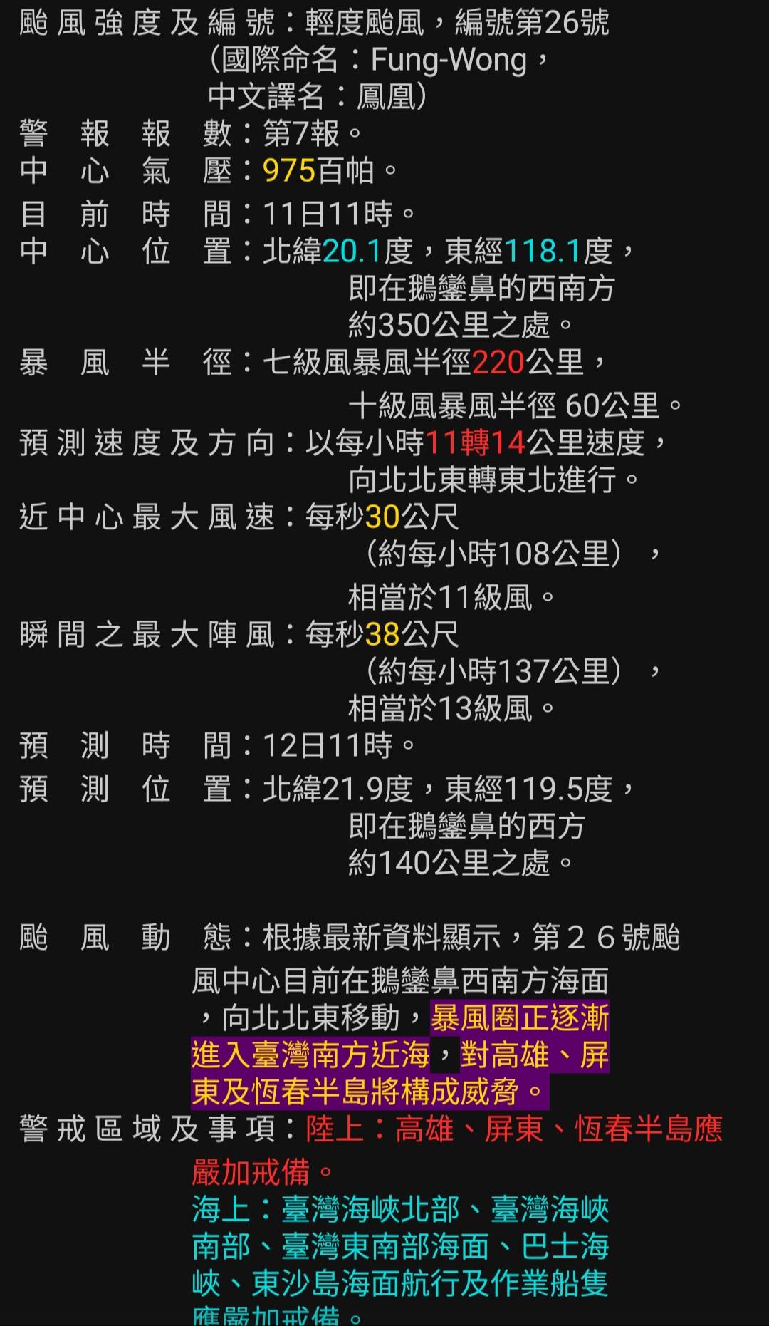 推 wattswatts : 編號第26號颱風警報 第7報 11/11 11:58