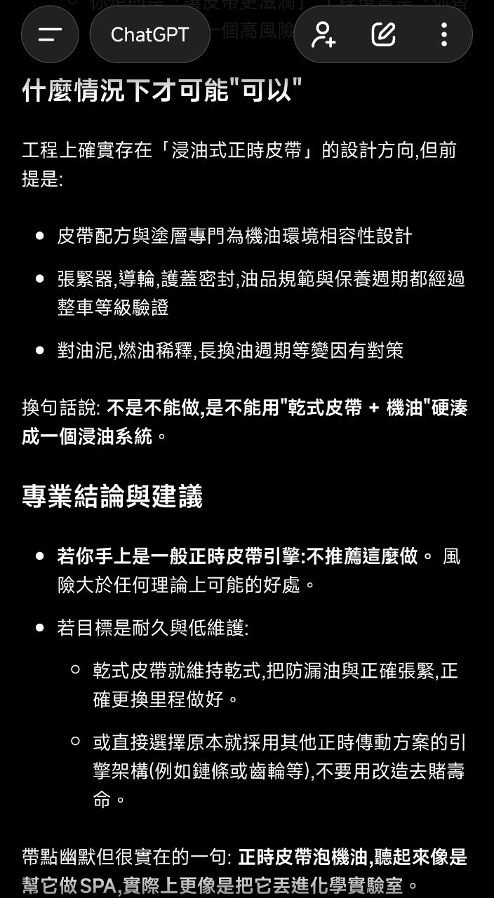 → linleex: 使用成本其實跟乾式皮帶差不多,只是大部分人換鍊條前就 12/27 10:13